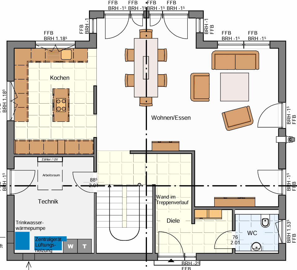 - Über Luftauslässe in der Decke (im EG) bzw. in den Wänden (OG) wird kontinuierlich frische Luft (warme Luft im Winter oder kalte Luft im Sommer – einstellbar) in die Räume gebracht