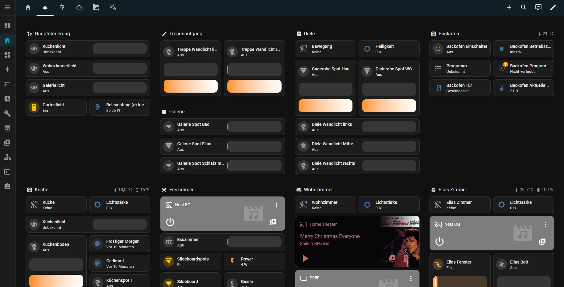 - Steuerung und Zugriff auf div. Smart Home-fähiger Geräte wie, Smart Lock, AV-Receiver, TVs, Smarte Displays, Wetterstation, Backofen, Waschmaschine, verschiedener Innen- und Außenbeleuchtung (z.B. aktivierbar über Bewegungs- und Licht-Sensoren oder GPS – Coming-Home, Leaving-Home) über Home Assistant